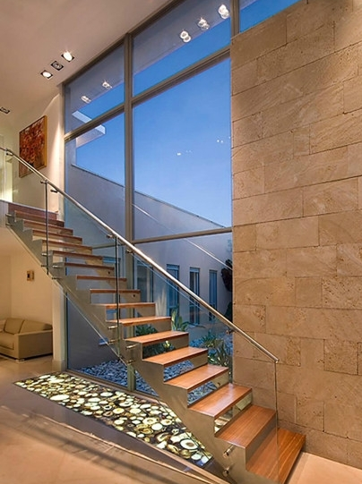 玻璃:本身所具有的通透感在用做樓梯裝飾時,效果更是不凡。現(xiàn)在市場上有噴花玻璃和鑲嵌玻璃,可以把它用在樓梯扶欄處,更絕妙的用法是將樓梯臺階做成中空的,內(nèi)嵌燈管,以特種玻璃做踏腳板,做成可以發(fā)光的樓梯。