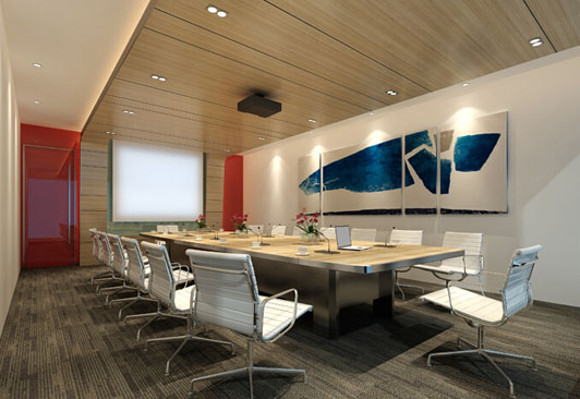 會議區辦公室裝修采用了進口高級木質板材來做了平面天花和投影背景墻,表達簡單的裝修就是最好的理念,展現高檔辦公室豪華裝修的真是品質,確立它的地位和權威。石膏板加隔音棉的墻身,加強會議室的隔音效果,這是辦公室豪華裝修才有的高級材料。非常高貴大氣的裝修。