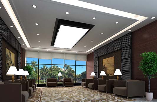 辦公室的頂面采用了凹槽造型石膏板天花的裝飾,是非常杰出的建材行業(yè)公司辦公室裝修的案例代表。